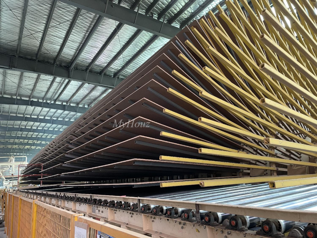 MyHouz's cooperative factory, from the input of a piece of eucalyptus wood to a qualified and high-quality Shuxin Board, all adopt the Dieffenbacher production line imported from Germany, and all 17 production processes are operated by computer data, fully automated paving and pressing molding, truly achieving intelligent integrated production.