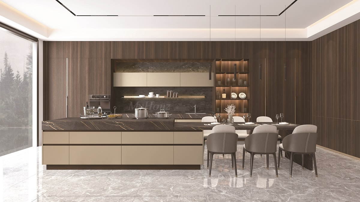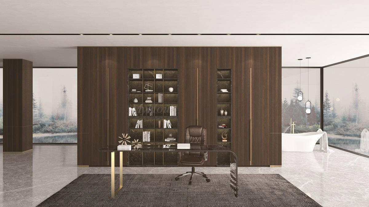 The wood texture of oak, after smoking processing, it shows more atmospheric hardness, collision with natural marble texture, so that the minimalist space has a richer level of connotation; Dotted with dumb gold wire metal texture, personality with luxurious with low profile.
