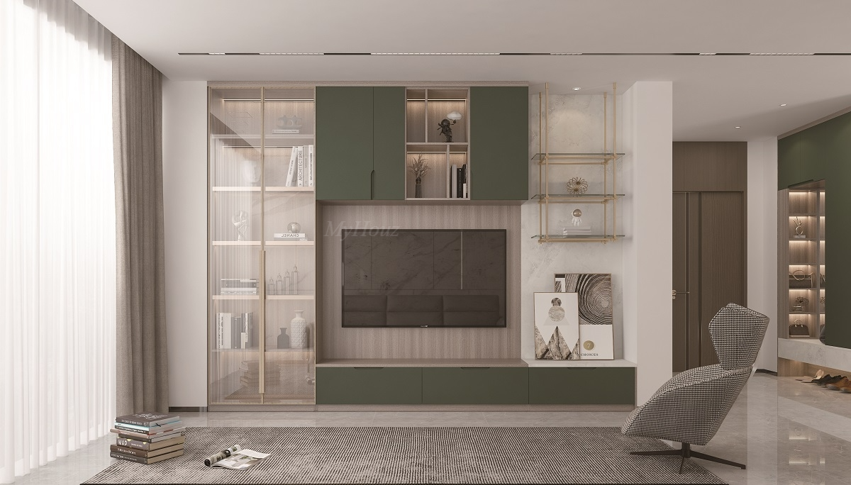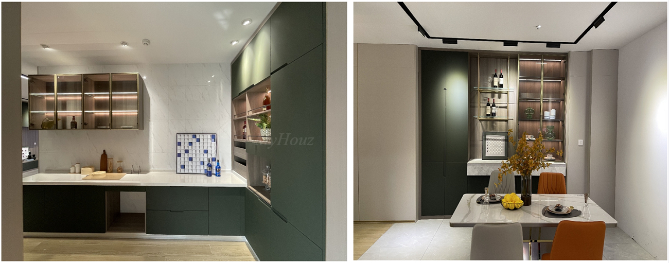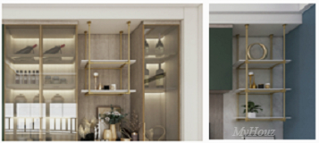 The light golden color of the metal shelving brings warm and bright atmosphere, en-hances the texture of the whole space an-d makes the whole residence space with high quality.