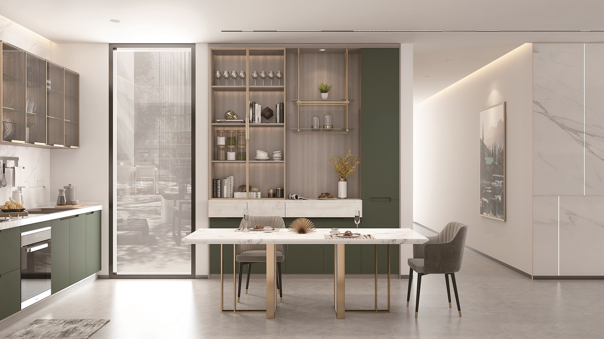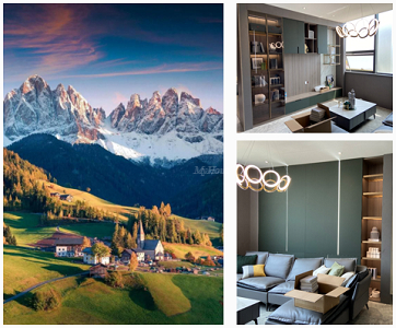 The color of the forest in the shadow of the sun turns into the Tai Emperor grey pomelo. The Ven-etian white is the texture and color presented by the snow on the mountains. The addition of the wild green adds the atmosphere of grassland to the space and creates a natural and harmonious living space.