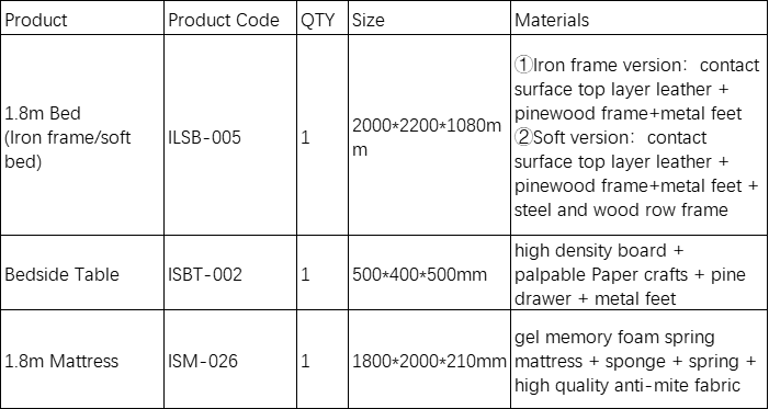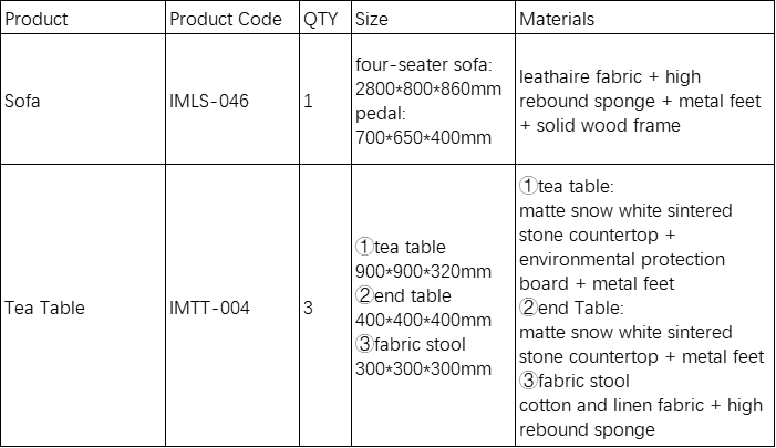 Total 14 Pieces Product Combo Package Living Room: 4-seat Sofa + Pedal + One Set Tea Table Dining Room: Dining Table & Chairs Master Room: 1.8m Bed + Mattress + Bedside Table Guest Room: Sofa Bed