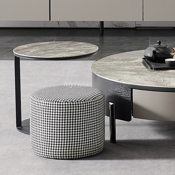 Materials: fabric stool: cotton and linen fabric + high rebound sponge; small round tea table: sintered stone + metal feet