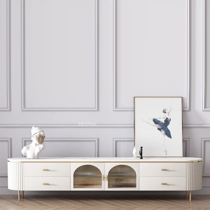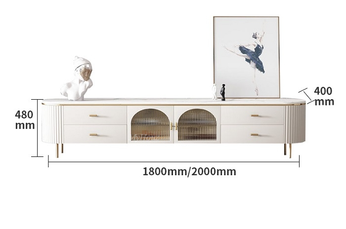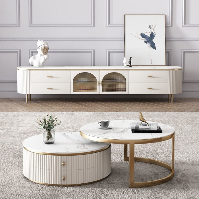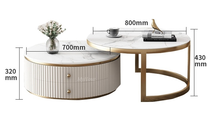 Materials: small tea table snow white sintered stone countertop + environmental protection cabinet + metal feet, big table snow white sintered stone countertop + metal feet