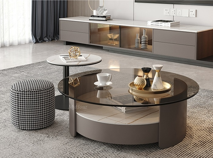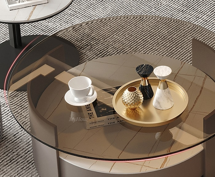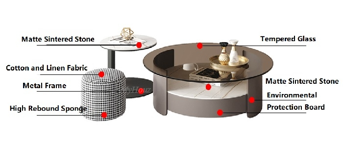 Materials: Table: tempered glass + Lauren white gold matte sintered stone + environmental protection board, End Table: Lauren white gold matte sintered stone + metal frame, Stool: cotton and linen fabric + high rebound sponge