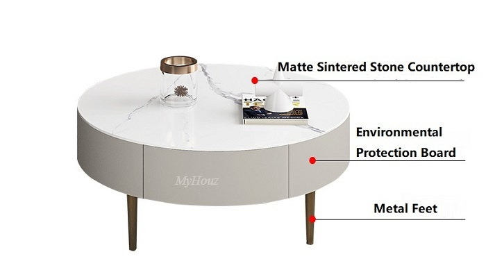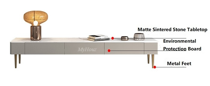 Materials: Matte snow white sintered stone tabletop + environmental protection board + metal feet