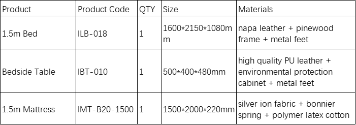 Bedroom: 1.5m Bed + Mattress + Bedside Table