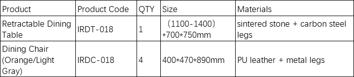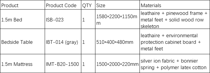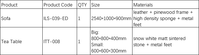 Total 11 Pieces Product Combo Package Living Room: Sofa+ One Set Tea Table Dining Room: Dining Table & Chairs Bedroom: 1.5m Bed +1.5m Mattress + Bedside Table